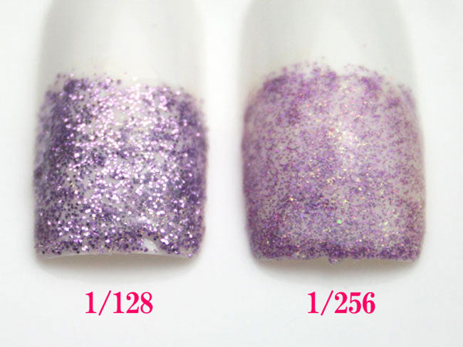 従来のラメグリッターは1/128ですが、こちらのグリッターは1/256ですので、倍の細かさです。サラサラして使いやすいグリッターです。