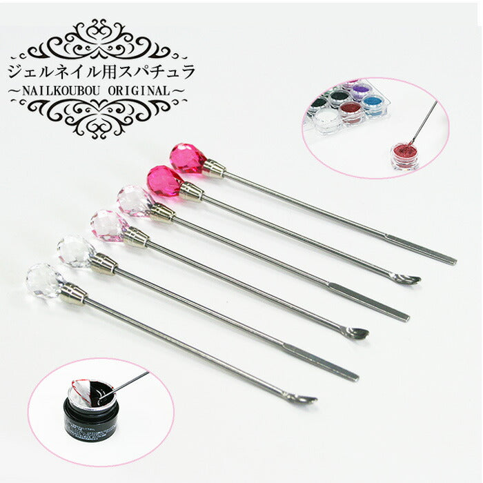 ジェルは内容物が比重の差で沈殿してしまっていることが多いので、そのまま使用してしまうとカラーのムラや未硬化の原因となってしまいます。必ず使用前にはジェル全体を良く混ぜる必要があります。 カラージェルのオリジナルカラー作成の際のラメやカラーのミックスにはもちろん、容器間での移す際など、特にラメ入りのカラージェルなどは沈殿が多い為使用前に良く撹拌しましょう。 スパチュラはジェルネイルの必需品の1つとなっております。
