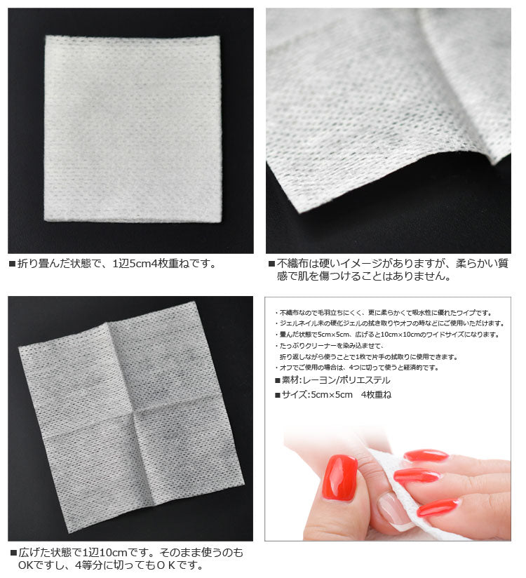 お試し30枚セット サイズ/5cm×5cm 4枚重ね ・不織布なので毛羽立ちにくく、更に柔らかくて吸水性に優れたワイプです。 ・ジェルネイル未の硬化ジェルの拭き取りやオフの時などにご使用いただけます。 ・畳んだ状態で5cm×5cm、広げると10cm×10cmのワイドサイズになります。 ・たっぷりクリーナーを染み込ませて、折り返しながら使うことで1枚で片手の拭取りに使用できます。 ・オフでご使用の場合は、4つに切って使うと経済的です。 |