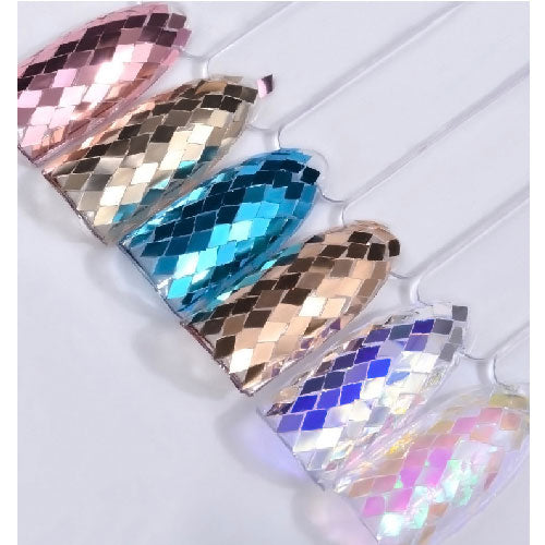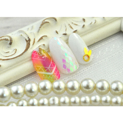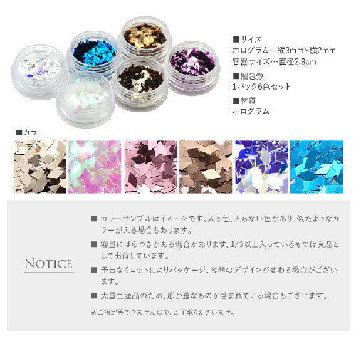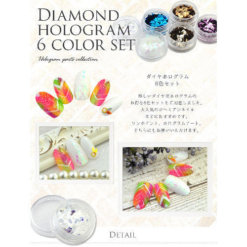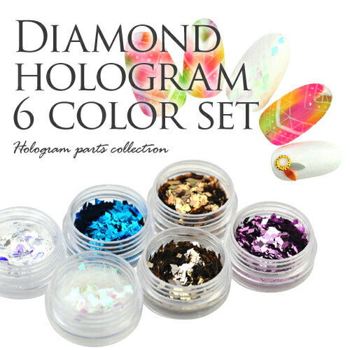 | 珍しいダイヤ型ホログラムのお得な6色セットをご用意しました。 大人気のボヘミアンネイルなどにおすすめです。 ワンポイント、ホログラムアート、どちらにもお使いいただけます。 |