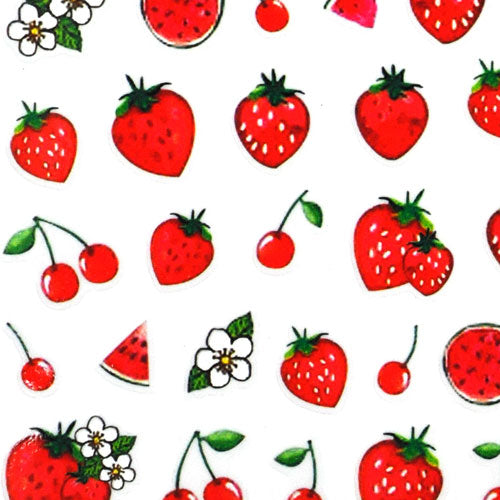 フルーツ(Fruits) 苺やさくらんぼ、スイカなどのフルーツをまとめたネイルシールです。 赤系のフルーツたちが、元気なネイルアートの手助けをしてくれます。 -------------------------------------- 薄さ:とても薄く貼っている感じがありません。 透け感:なし いちごのサイズ:6mm~10mm |