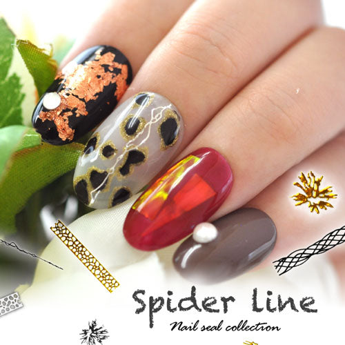 スパイダーライン(Spider line) ジェルアートの、たらし込みアートでするような模様ですが、 ここまで細かい模様にするのは時間がかかります。 印象的なスパイダーのラインのアートが時短できるネイルシールです。 ベースカラーを選ばず、アートにスパイスをプラスできます。 -------------------------------------- 薄さ:とても薄く貼っている感じがありません。 透け感:なし ラインのサイズ:2mm~7mm |