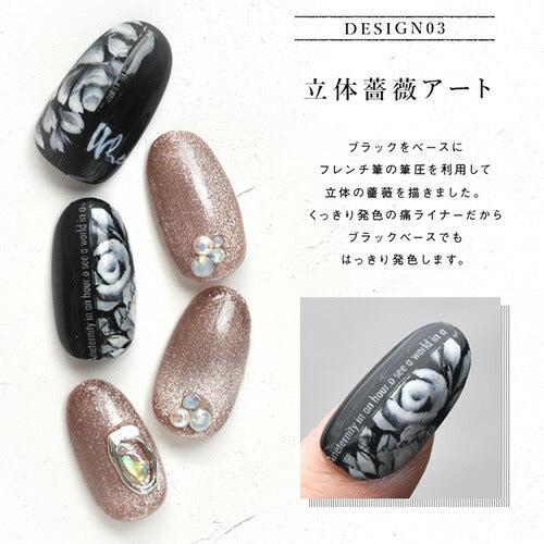 痛 liner(ライナー) 爪先をキャンバスに ジェルネイルに慣れてきたらアートがしたい ジェルネイルを始めるきっかけは SNSの痛ネイルだった 誰もが憧れるアートのためのジェル 『痛ライナー』 痛 liner(ライナー) point 01 アクリル絵の具のような質感 ネイリストの中には未だにアクリル絵の具で アートをしている方がいます。 乾くのに時間がかかるのに、なぜ!? それは、発色◎、伸び◎、透けないから。 痛ライナーはアクリル絵の具に似た質感で、 発色◎、伸び◎、透けないの 三拍子が揃っています。 痛 liner(ライナー) point 03 そのままミラーパウダーが使える 痛ライナーは未硬化ジェルが 本当に少ないんです。 だから、痛ライナーを硬化した後は そのままミラーパウダーを スリスリできます。 ■テクスチャー 痛ライナーはアクリル絵の具に似た質感で、発色◎、伸び◎、透けないの三拍子が揃っています。 発色:良し◎ 伸び:良し◎ にじまない 硬化時間:LED48W・・・40秒/UV36W・・・120秒 ※塗布量により硬化時間を長く設定して下さい。 商品仕様 区分:雑貨 使用方法:ベースジェルの上から爪にご使用ください。 |