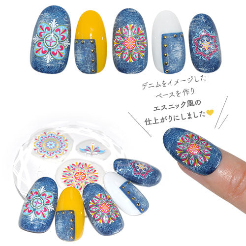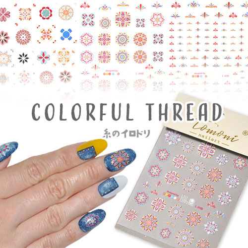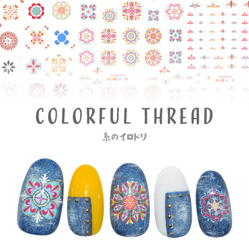 colorful thread 糸のイロドリ 刺繍糸で作られた様な カラフルなお花モチーフ 描く事が難しい柄もお手軽に デニムをイメージしたベースを作り エスニック風の仕上がりにしました -------------------------------------- 薄さ:凹凸に強弱があります。 透け感:なし モチーフの幅:5~15mm |