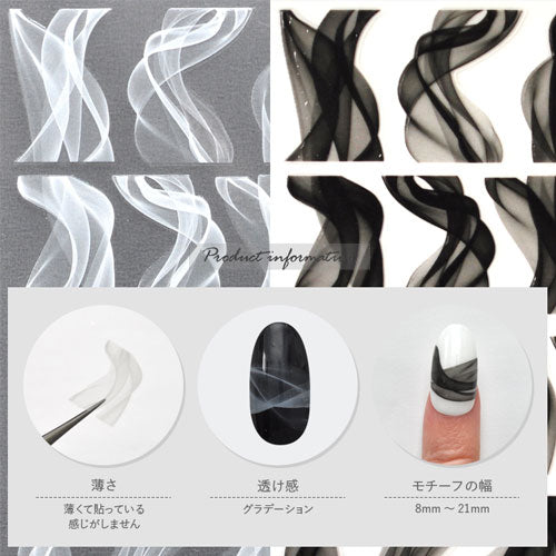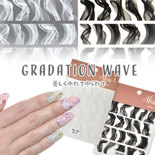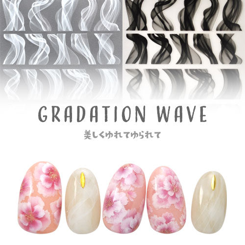 Gradation Wave 美しくゆれてゆられて 不規則な曲線のラインが美しく 重なりのグラデーションが とても綺麗なネイルシールです ホワイトカラーのジェルに 細い揺れるラインが美しい 自然な仕上がりにしました --------------------------------------- 薄さ:薄くて貼っている感じがしません 透け感:グラデーション モチーフの幅:8mm~21mm |