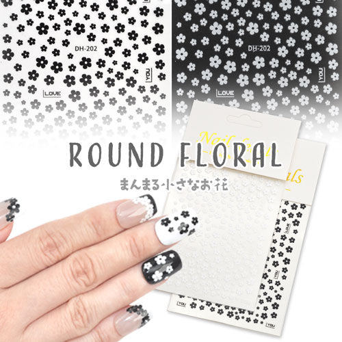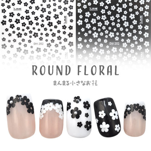 Round Floral まんまる小さなお花 小さくて愛らしい丸みのあるフォルムが目を惹くシールです とても小さいお花は さまざまなスタイルやシーンに合わせてアレンジできますよ お花を並べて フレンチネイルの アクセントにしました -------------------------------------- 薄さ:薄くて貼っている感じがしません 透け感:なし モチーフの幅:2mm~6mm |